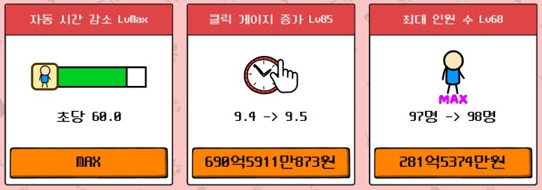 손님은 자동시간감소 초당60, 클릭게이지증가 10, 최대인원수 100명 까지 업그레이드 가능하다.